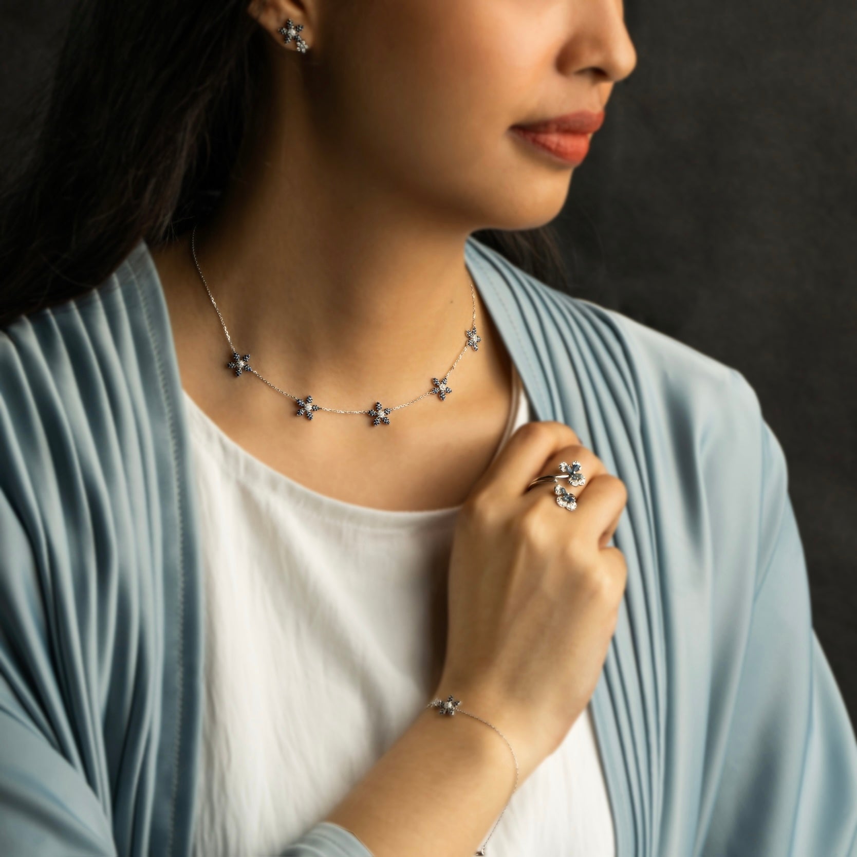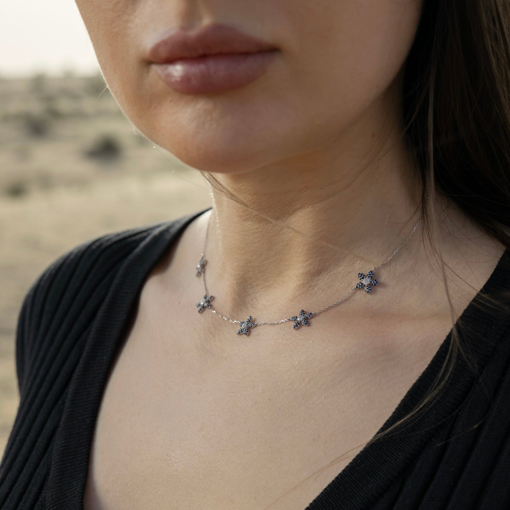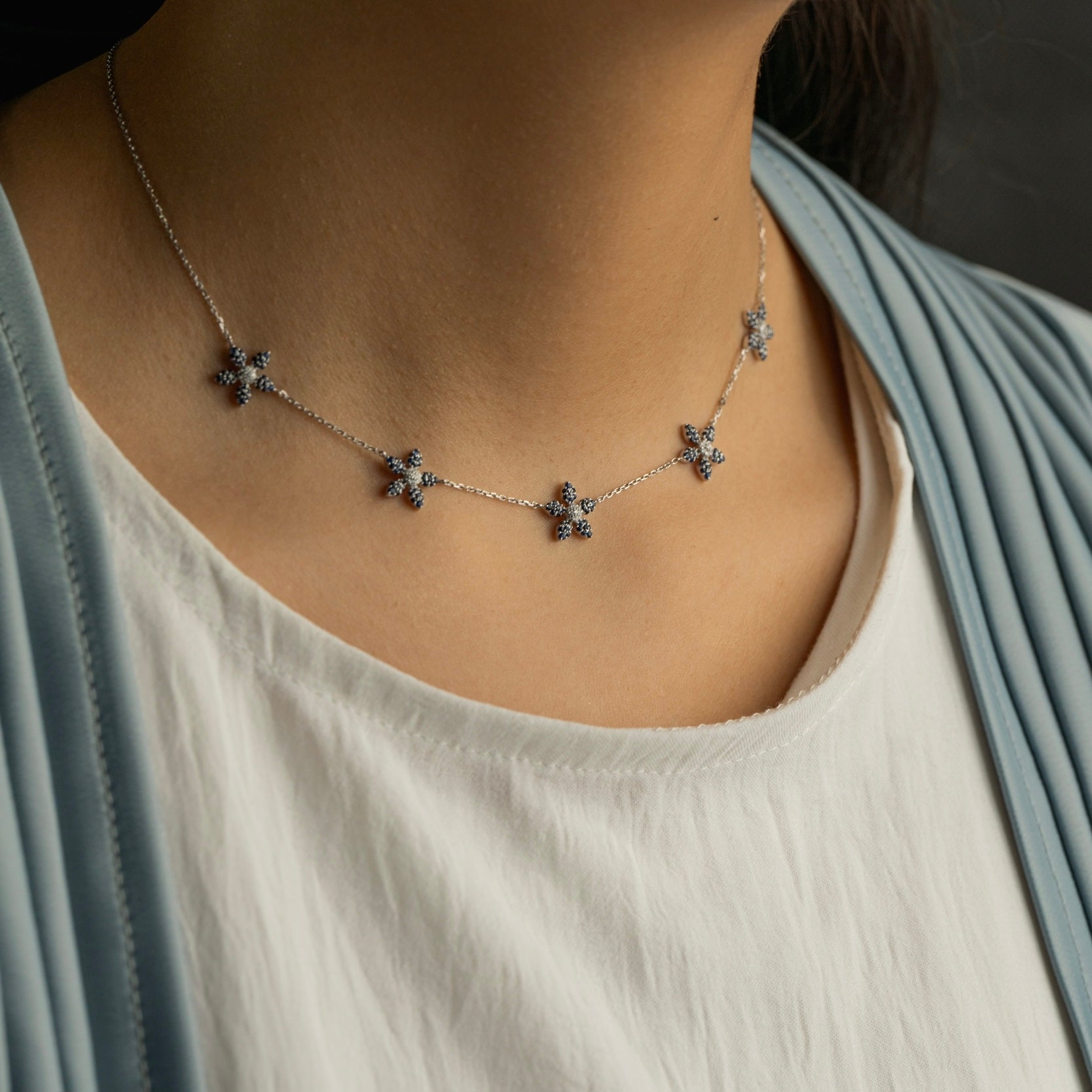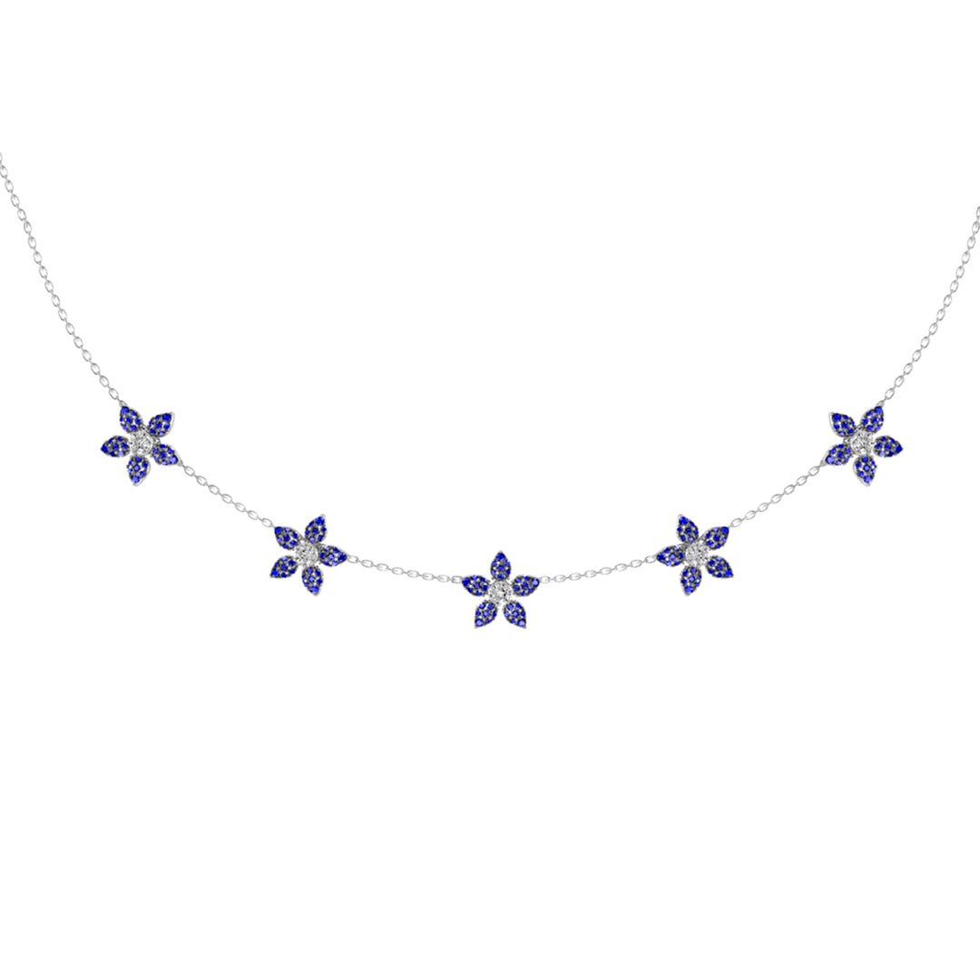 • Elevate your elegance with the Alyrah Necklace, a stunning addition to our Maitha collection. This exquisite piece features five intricately designed flowers, each adorned with vibrant blue sapphires and sparkling diamonds. Inspired by the beloved Blue Nasturtium flower, the Alyrah Necklace captures the essence of sophistication and timeless beauty.