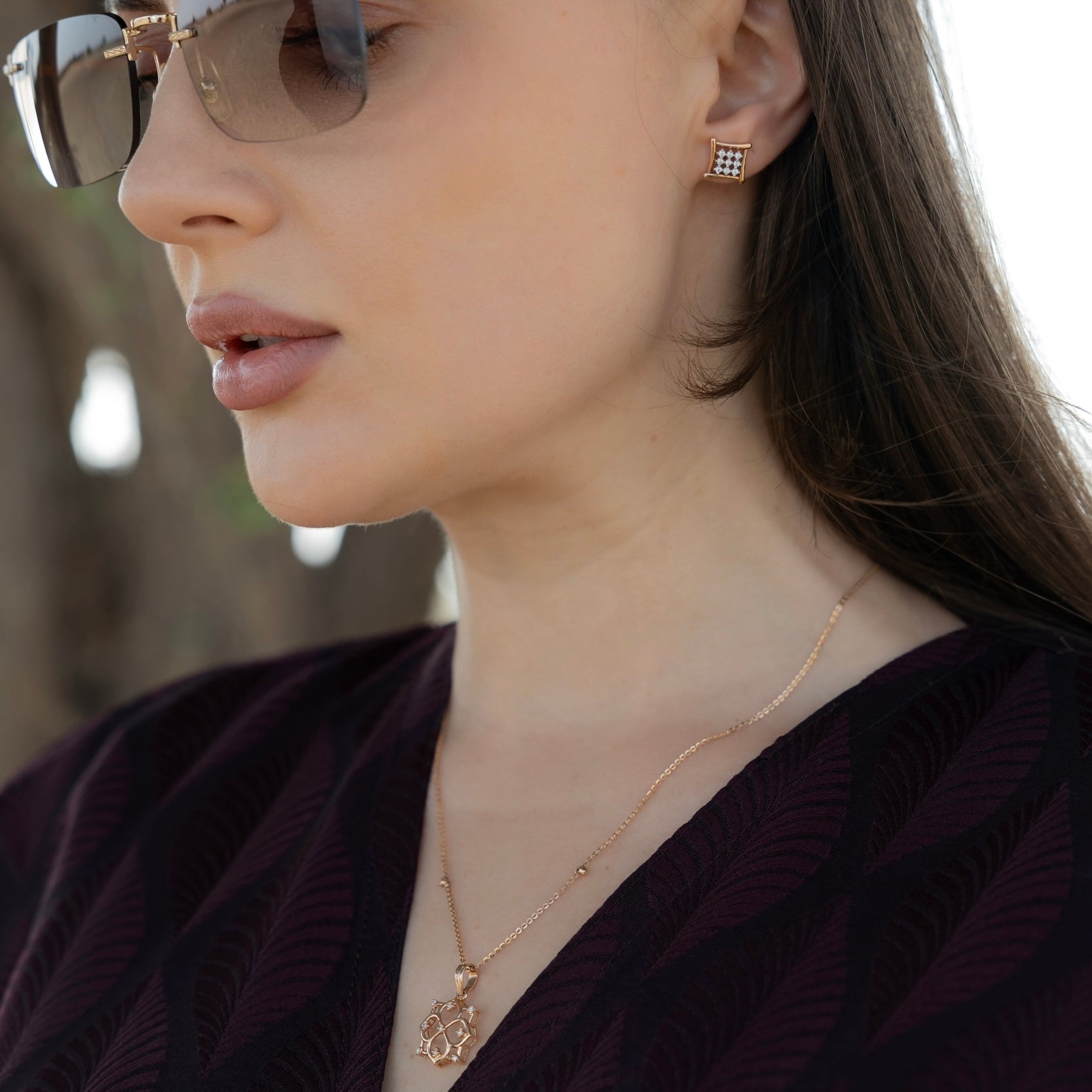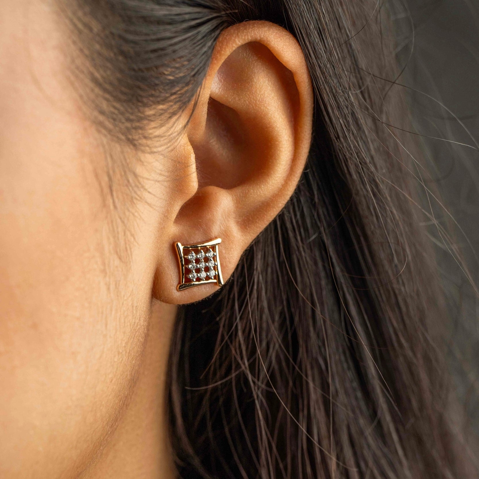 The Hayal earrings are inspired by the serene beauty of the Rawdah Mubarak, drawing from the intricate design of the golden and green bars that frame this sacred space. The earrings feature a square design with diamonds arranged in a grid-like pattern, echoing the structure and elegance of the bars.